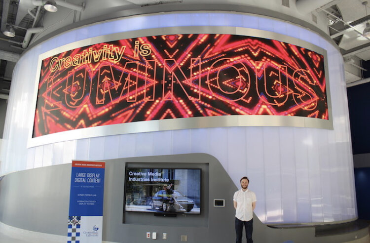 Monroe created the original default typographic motion graphics for the 34ft CMII LED screen overlooking Woodruff Park and downtown GSU (25 Park Place, Atlanta, GA).