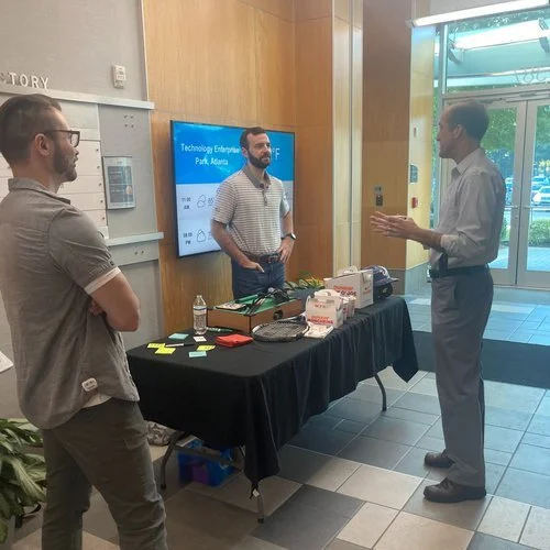 Positioned in the lobby of Technology Enterprise Park (TEP), and armed with fresh coffee and munchkin doughnuts, we asked our community members – even a couple from the Advanced Technology Development Center (ATDC) who drove over just for the activation – to share what new inventions would make sports more fun to watch or play!
