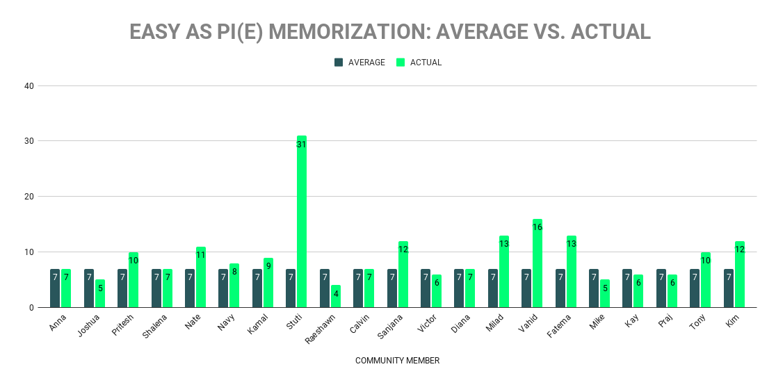 To no surprise, our community of researchers, scientists, chemists, and engineers performed really well! Majority of members (71%) were able to memorize the average (7 digits) or more! But one attendee really took the cake – or pi(e), in this case. Stuti Sagar, an Engineer II at Abbott, correctly recited an astonishing 31 digits! And her amazing memorization skills earned her more than a slice of pie and an adult beverage – she also received an Amazon gift card for all of her hard work!