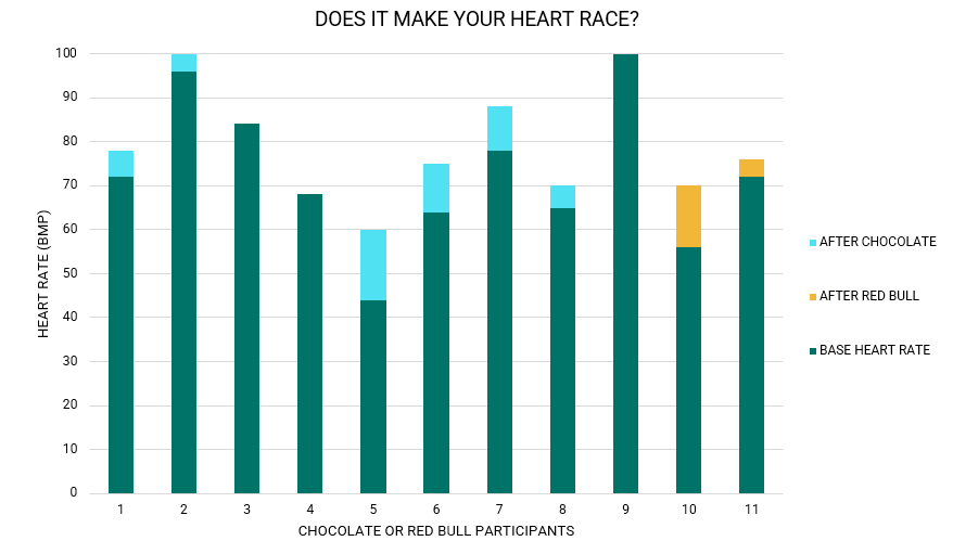 Despite some saying “love is blind” (season two is streaming now!), the data clearly showed us that our attendees favored chocolate over the energy drink and 45 percent of people experienced an elevated BPM after consuming the sweet treat! Even more interesting was that 27 percent didn’t experience any change, despite the caffeine and sugar. Speaking of, it would take four Dove chocolates to match the amount of sugar in one can of 8.4-ounce Red Bull. In general, 63 percent of our participants reported a higher BPM after consuming one of the two options!