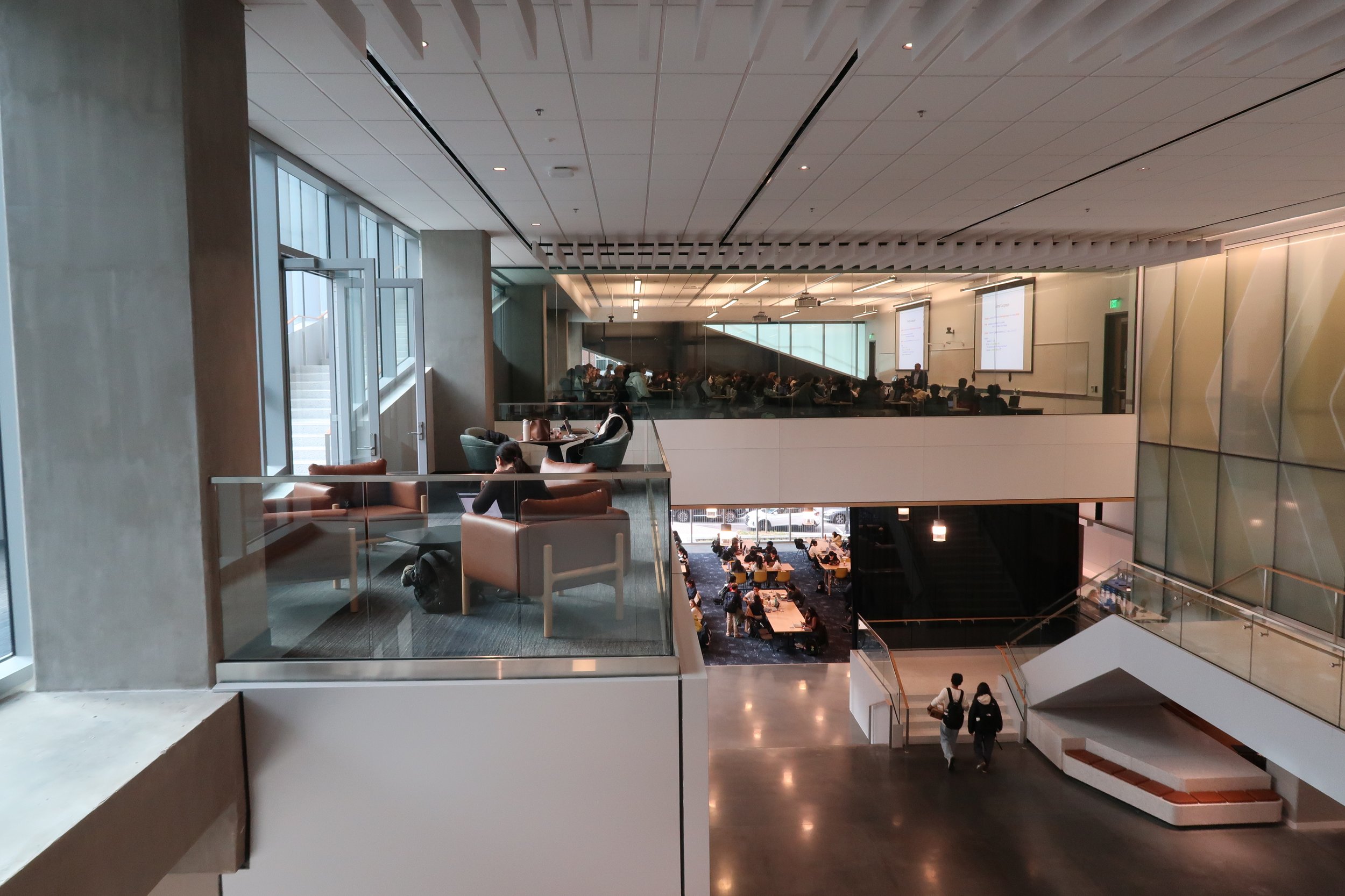 The newly opened levels feature a shared main lobby anchored by a vast staircase, alongside 11 classrooms spread across the second and third floors. Huddle rooms and conference spaces are woven throughout the buildings, supporting both formal instruction and informal collaboration. Generous indoor and outdoor gathering areas along Fifth Street further extend Tech Square’s public-facing energy.